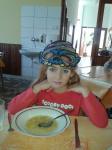 Oběd: Květáková polévka s bramborem, žemlovka s jablky a tvarohem, ovoce k obědu, ochucené mléko, džus,